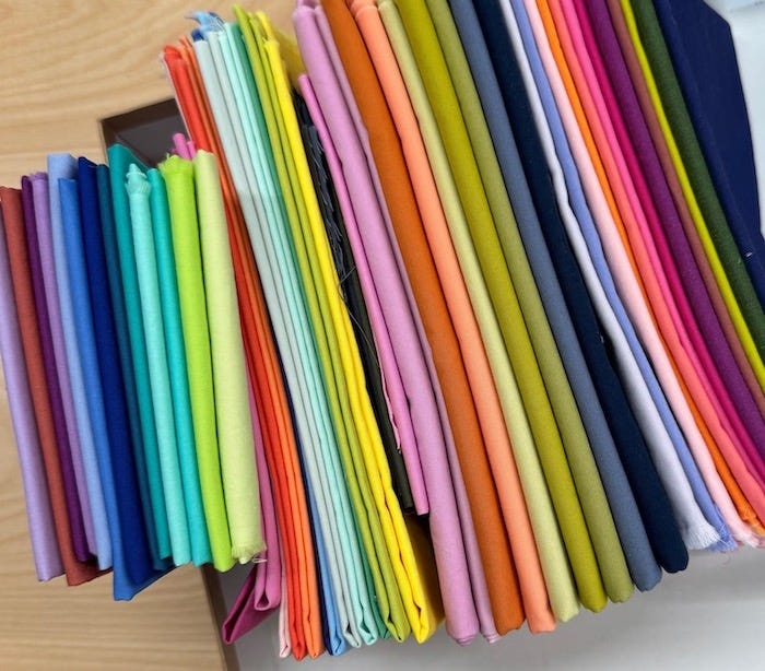 A box of brightly colored fabric beckoned, the washed and neatly folded solids inviting me to play. These materials are part of a Tara Faughnan workshop I signed up for last year. Once a month she sends a new twelve-color palette and a new design for a patchwork block.