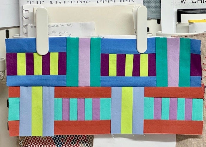 I had so much fun cutting and stitching up the February assignment that all I wanted to do for days after was think about colorful rectangles. During my next visit to the studio I could not resist sewing a new block, and have since started a third. My mood has definitely improved!