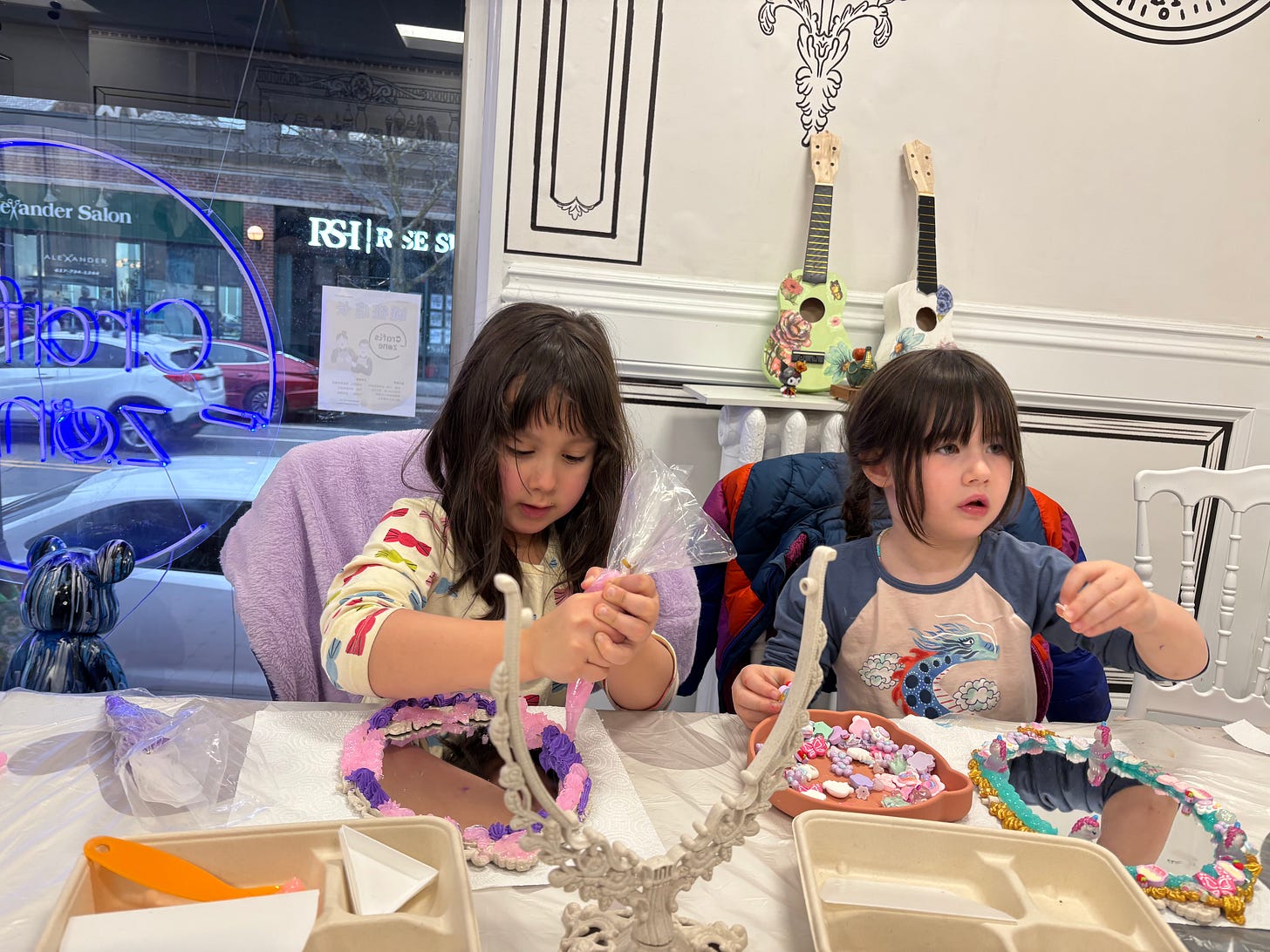 It was evident by the sophistication of some of the projects (including delicate doll house furniture and working race car models) that this crafts studio was geared as much to adults as to children. All the many choices clearly delighted my daughter and my granddaughters as they sorted through the seemingly endless possibilities and imagined the array of potential end products. I, on the other hand, picked the first project I saw that involved no plastic and painted that ukulele so fast, the base coat was dry by the time everyone else arrived at the worktable to start their projects.