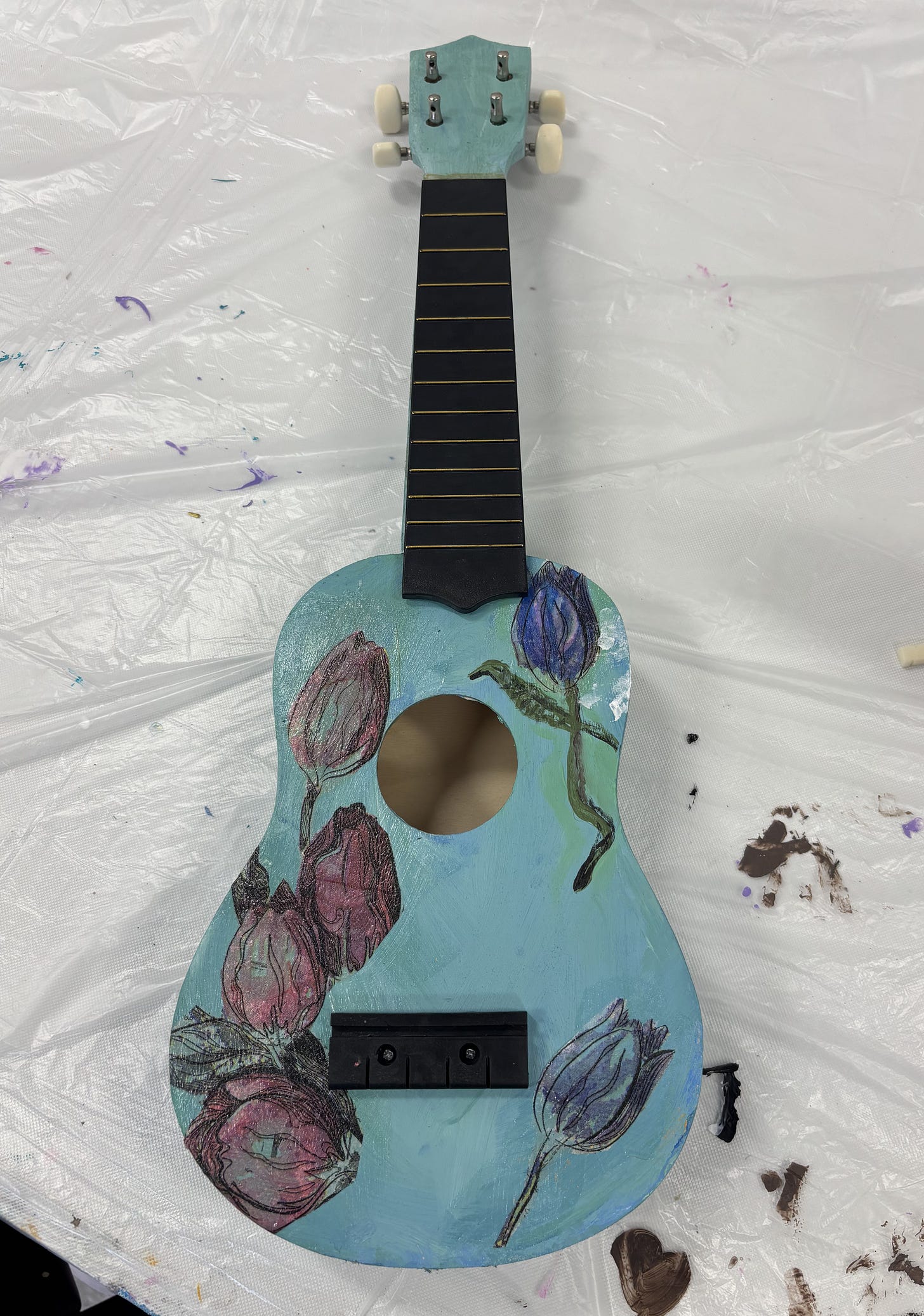 Glue and a selection of art drawn on sheaves of super thin, see-through paper. After scissoring out the flowers I wanted and delicately peeling off the backing, I attached them to the painted ukulele with swipes of the glue brush. Crafts 101, but still a personal challenge.